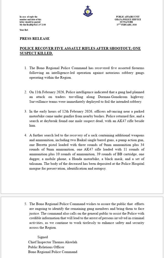 According to a press release signed by Chief Inspector Thomas Akeelah, Public Relations Officer of the Command, police intelligence on February 11, 2026, indicated that a gang had planned to attack traders travelling along the Dormaa–Gonokrom highway. Surveillance teams were immediately deployed to the area to foil the intended robbery.